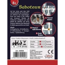 sonstiges: Die Spieler werden in Goldsucher und Saboteure eingeteilt. Doch wer welche Rolle erhält, bleibt geheim. Ziel ist es so viel Gold wie möglich zu sammeln.