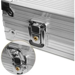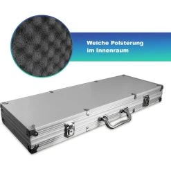 Lieferumfang: 500x Casino Laserchips mit Metallkern (150x silber, 100x grün, 100x rot, 50x blau, 50x schwarz, 25x lila, 25x gelb), 2x Kartendeck mit je 54 Karten, Dealer Button, 5x große transparent-rote Würfel, Aluminium-Koffer mit Schlüssel (2x)