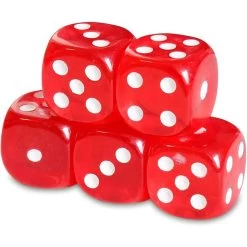 • Mit 5 großen transparent-roten Würfeln und Dealer Button
