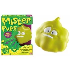 sonstiges: Das Mister Pups Gerät hat ordentlich Blähungen, und ihm kann jederzeit ein Pups entfahren. Es wird mittig auf den Tisch gestellt, und dann bekommt jeder Spieler drei Mister Pups Karten. Die Spieler legen abwechselnd Mister Pups Karten mit Zahlen ab und drßcken das Mister Pups Gerät entsprechend der Zahl auf der Karte. Pupst das Gerät, während ein Spieler an der Reihe ist, scheidet er aus.