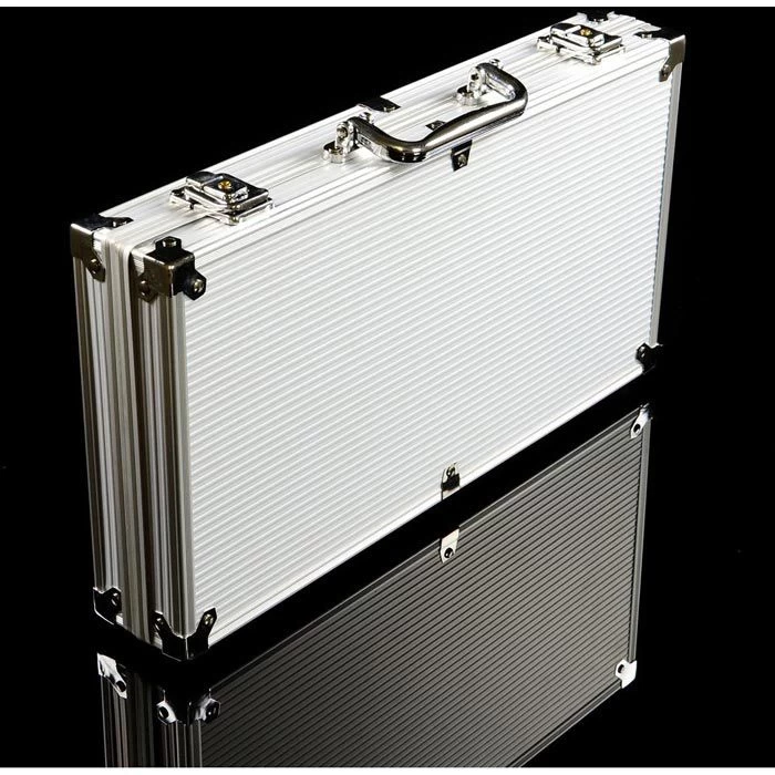 Lieferumfang: 300x Pokerchips (100x schwarz, je 50x grün, rot, blau, weiß), 2x Kartendeck mit je 54 Karten, Dealer Button, Small Blind, Big Blind, 5x Würfel in rot, Spielregeln, Aluminium-Koffer mit Schlüssel (2x)