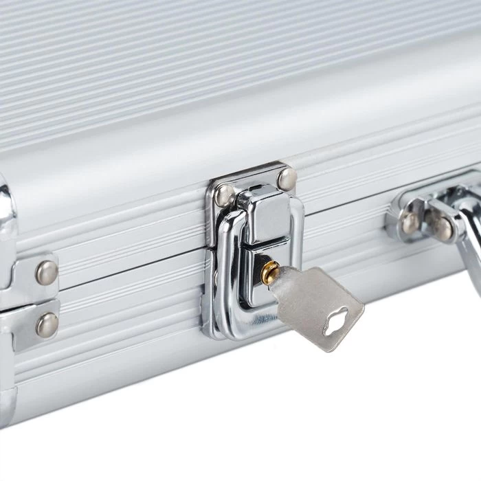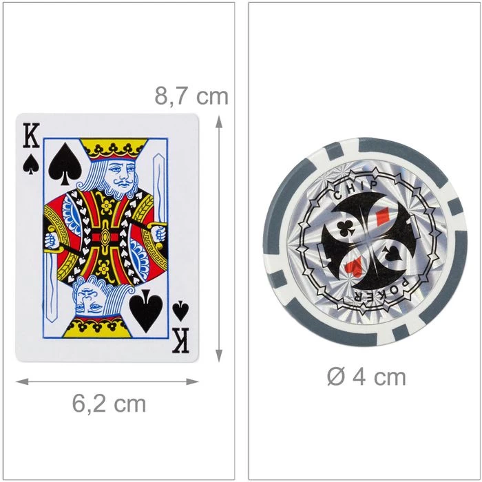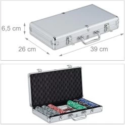 Lieferumfang: 300x Laser Pokerchips (100x grau, je 50x schwarz, blau, grün und rot), 2x Kartendeck mit je 54 Karten, Dealer Button, 5x Würfel in rot, Aluminium-Koffer mit 2 Schlüsseln